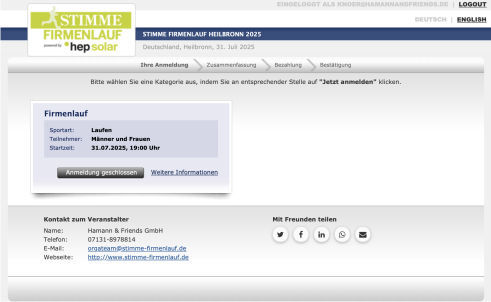 Die Teilnahme erfolgt auf eigenes Risiko! Vom Veranstalter/Ausrichter wird keine Haftung für Schäden jeglicher Art übernommen. Teilgenommen werden darf nur, wenn von ärztlicher Seite keine ausdrücklichen gesundheitlichen Bedenken bestehen. Jeder Teilnehmer erkennt die allgemeinen Teilnahmebedingungen und die Datenschutzerklärung der Veranstaltung mit seiner Anmeldung an. Gerichtsstand ist Heilbronn.